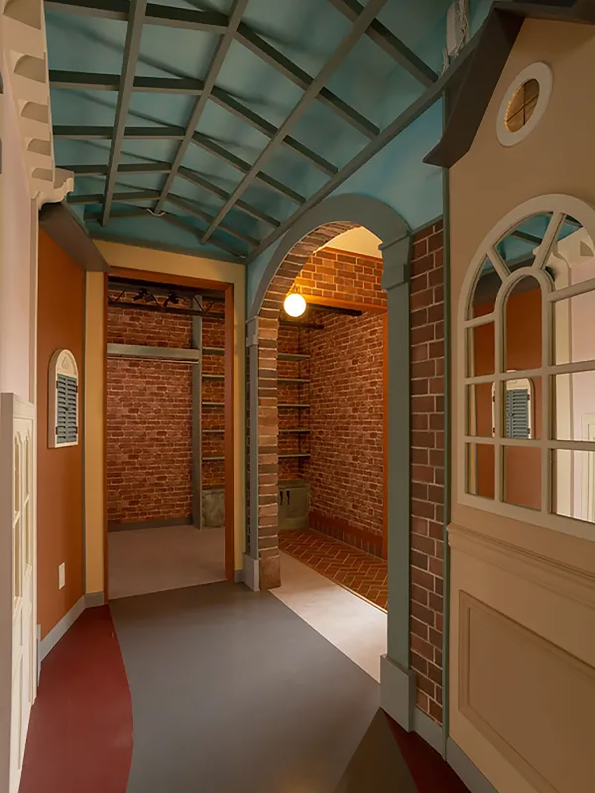 たとえ実際は2階建てでも、3階建てに見えるようにデザインされており、アーケード内でも建物をより高く見せる錯覚効果が生まれます。