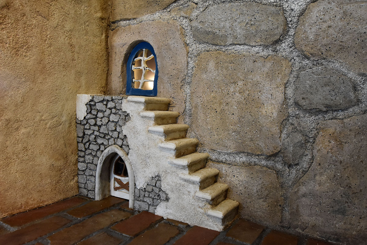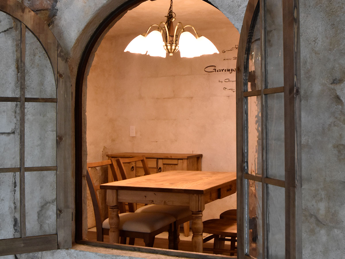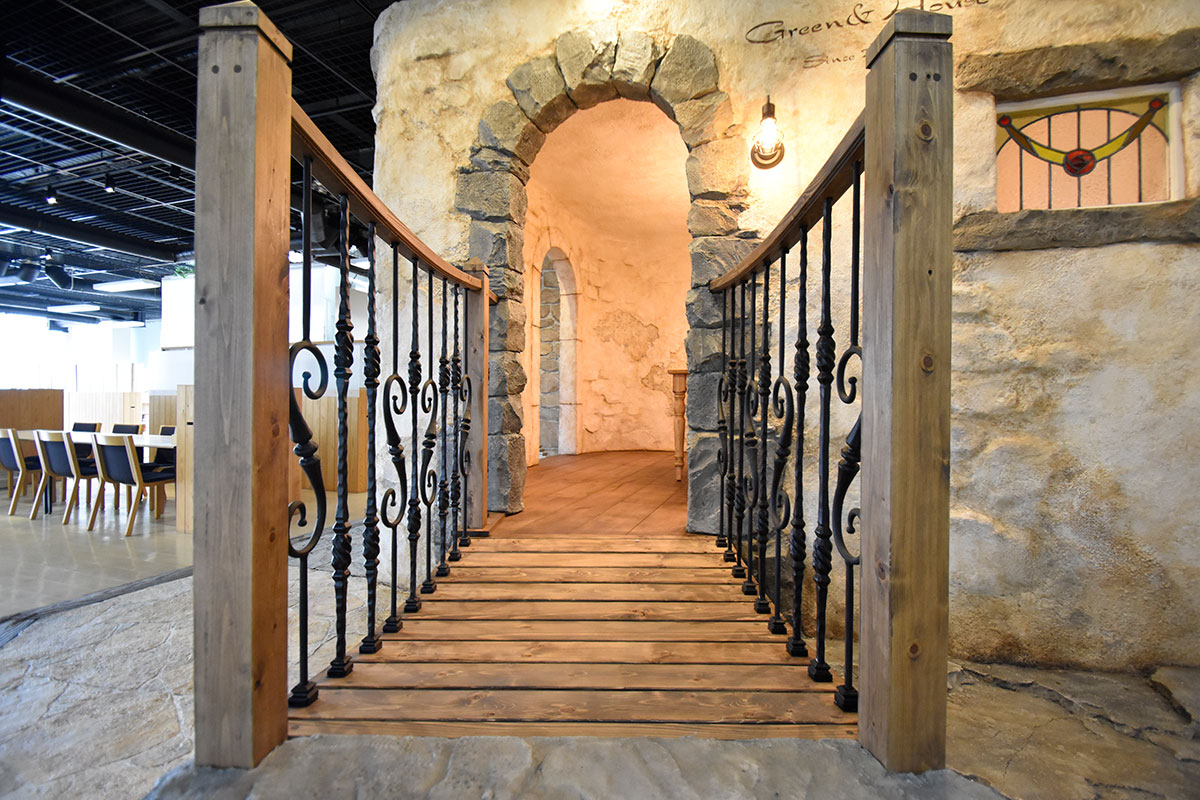 まるで何百年もそこに存在していたかのようなアンティークな石積みの壁、使い込まれた風合いを再現した木の質感。
